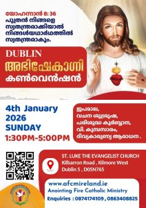 ഡബ്ലിൻ : ബഹുമാനപ്പെട്ട സേവ്യർ ഖാൻ വട്ടായില് അച്ഛനിലൂടെ പരിശുദ്ധാത്മാവ് തുടക്കം കുറിക്കുകയും കഴിഞ്ഞ രണ്ട് ദശാബ്ദങ്ങളായി കേരള കത്തോലിക്ക സഭയില് ആത്മീയ ഉണര്വിന് കാരണമാവുകയും ചെയ്ത അഭിഷേകാഗ്നി വചന ശുശ്രൂഷ ഡബ്ലിനില് നടത്തപ്പെടുന്നു. യുകെ ഉള്പ്പെടെയുള്ള ലോകത്തിന്റെ വിവിധ രാജ്യങ്ങളില് നടന്നുവരുന്ന അഭിഷേകാഗ്നി വചന ശുശ്രൂഷ 2026 ജനുവരി നാലാം തീയതി ഡബ്ലിന് 5-ലെ സെന്റ് ലൂക്ക് ദേവാലയത്തില് 1:30 pm മുതല് 5:00 pm വരെയാണ് ഒരുക്കിയിരിക്കുന്നത്.