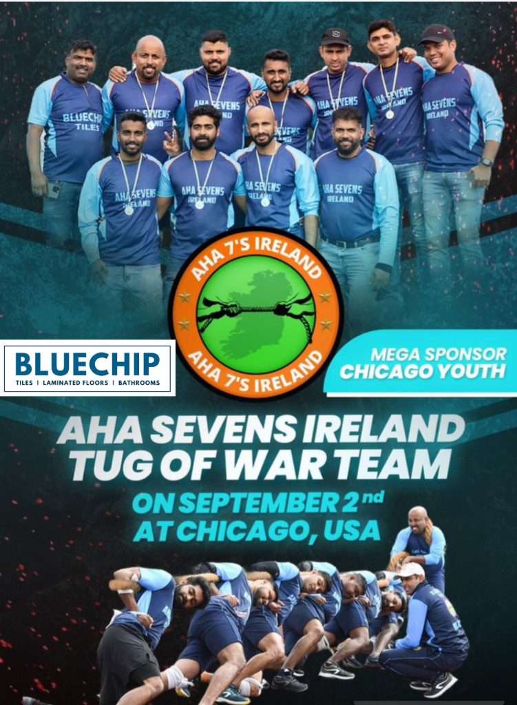 BLUECHIP TILES-ന്റെ സ്വന്തം AHA SEVENS അമേരിക്കയിൽ. ഈ വരുന്ന തിങ്കളാഴ്ച്ച (സെപ്റ്റംബർ 2) ചിക്കാഗോയിൽ നടക്കുന്ന വടംവലി മത്സരത്തിൽ പങ്കെടുക്കുവാൻ ഇമ്മാനുവൽ ടോമിയുടെ നേതൃത്വത്തിൽ ടീം AHA അമേരിക്കയിൽ എത്തി. അയർലണ്ടിൽ കഴിഞ്ഞ രണ്ടുവർഷമായി നിരവധി മത്സരങ്ങളിൽ വിജയികളായ ആഹാ, ഇനി അമേരിക്കയിലും വിജയക്കൊടി പാറിക്കുമോ എന്നറിയാൻ ഇനി ഏതാനും മണിക്കൂറുകൾ മാത്രം.