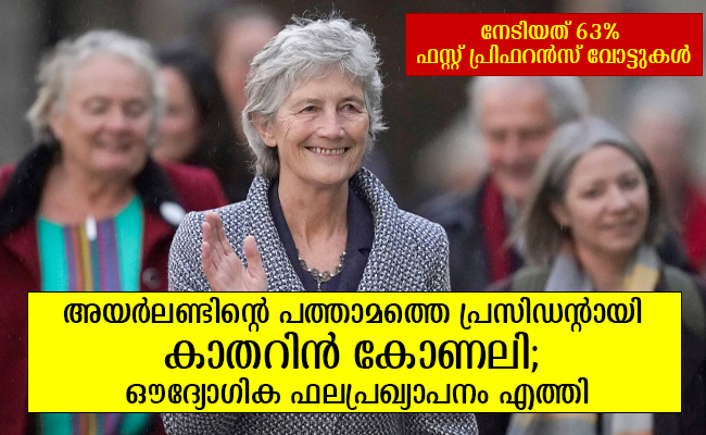 അയര്ലണ്ടിന്റെ 10-ആമത്തെ പ്രസിഡന്റായി സ്വതന്ത്ര ഇടതുപക്ഷ സ്ഥാനാര്ത്ഥി കാതറിന് കോണലി. ഒക്ടോബര് 24-ന് നടന്ന തെരഞ്ഞെടുപ്പില് 63% ഫസ്റ്റ് പ്രിഫറന്സ് വോട്ടുകള് നേടിയാണ് ഗോള്വേ സ്വദേശിയായ കോണലിയുടെ അധികാരിക വിജയം. ഇന്നലെ വോട്ടെണ്ണല് ആരംഭിച്ചത് മുതല് കോണലി മുന്നില് തന്നെയായിരുന്നു.