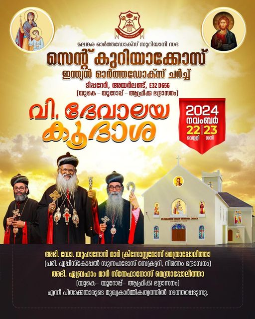 2024 നവംബർ 22, 23 തീയതികളിലായി നിരണം ഭദ്രാസനാധിപനും പരി. എപ്പിസ്ക്കോപ്പൽ സുന്നഹദോസ് സെക്രട്ടറിയുമായ അഭി. ഡോ. യൂഹാനോൻ മാർ ക്രിസോസ്റ്റമോസ് മെത്രാപ്പോലീത്തായുടെയും, യുകെ-യൂറോപ്പ്-ആഫ്രിക്ക ഭദ്രാസനാധിപൻ അഭി. ഏബ്രഹാം മാർ സ്തേഫാനോസ് മെത്രാപ്പോലീത്തായുടെയും മുഖ്യകാർമ്മികത്യത്തിൽ ടിപ്പററി സെന്റ് കുറിയാക്കോസ് ഇന്ത്യൻ ഓർത്തഡോക്സ് പള്ളിയുടെ കൂദാശ നടത്തപ്പെടും. എല്ലാ വിശ്വാസികളെയും കൂദാശയിലേക്കും മറ്റ് അനുബന്ധ ചടങ്ങുകളിലേക്കും പ്രാർത്ഥനാപൂർവ്വം സ്വാഗതം ചെയ്യുന്നതായി ബന്ധപ്പെട്ടവർ അറിയിച്ചു.