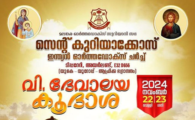 2024 നവംബർ 22, 23 തീയതികളിലായി നിരണം ഭദ്രാസനാധിപനും പരി. എപ്പിസ്ക്കോപ്പൽ സുന്നഹദോസ് സെക്രട്ടറിയുമായ അഭി. ഡോ. യൂഹാനോൻ മാർ ക്രിസോസ്റ്റമോസ് മെത്രാപ്പോലീത്തായുടെയും, യുകെ-യൂറോപ്പ്-ആഫ്രിക്ക ഭദ്രാസനാധിപൻ അഭി. ഏബ്രഹാം മാർ സ്തേഫാനോസ് മെത്രാപ്പോലീത്തായുടെയും മുഖ്യകാർമ്മികത്യത്തിൽ ടിപ്പററി സെന്റ് കുറിയാക്കോസ് ഇന്ത്യൻ ഓർത്തഡോക്സ് പള്ളിയുടെ കൂദാശ നടത്തപ്പെടും. എല്ലാ വിശ്വാസികളെയും കൂദാശയിലേക്കും മറ്റ് അനുബന്ധ ചടങ്ങുകളിലേക്കും പ്രാർത്ഥനാപൂർവ്വം സ്വാഗതം ചെയ്യുന്നതായി ബന്ധപ്പെട്ടവർ അറിയിച്ചു.