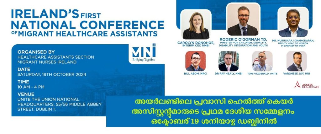 അയർലണ്ടിലെ പ്രവാസി ഹെൽത്ത് കെയർ അസിസ്റ്റന്റുമാരുടെ (HCA) പ്രഥമ ദേശീയ സമ്മേളനം ഒക്ടോബര് 19 ശനിയാഴ്ച ഡബ്ലിനിൽ യുണൈറ്റ് യൂണിയന്റെ ഹെഡ്ക്വാർട്ടേഴ്സിൽ വച്ച് നടത്തപ്പെടും. മൈഗ്രന്റ് നഴ്സസ് അയർലണ്ടിന്റെ ഹെൽത്ത് കെയർ അസിസ്റ്റന്റുമാരുടെ വിഭാഗം സംഘടിപ്പിക്കുന്ന സമ്മേളനത്തിൽ ആരോഗ്യമേഖലയിലെ വിശിഷ്ടാതിഥികൾക്കൊപ്പം, ഇക്വാലിറ്റി, ഇന്റഗ്രേഷൻ, ഡിസബിലിറ്റി, ചിൽഡ്രൻ വകുപ്പ് മന്ത്രിയായ റോഡറിക് ഓഗോർമാൻ മുഖ്യാതിഥിയാകും.