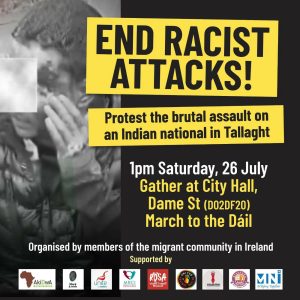 അതിനിടയിൽ കഴിഞ്ഞ ആഴ്ച താലയിൽ ഇന്ത്യക്കാരൻ വംശീയ ആക്രമണത്തിനാണ് ഇരയായത് എന്ന് ഗാർഡ സ്ഥിരീകരിച്ചു. സംഭവത്തിൽ ഇതുവരെ ആരെയും അറസ്റ്റ് ചെയ്തിട്ടില്ല. അന്വേഷണം നടത്തിവരികയാണ് എന്ന് ഗാർഡ അറിയിച്ചു. സംഭവത്തിൽ പ്രതിഷേധിച്ച് ഡബ്ലിനിൽ ഇന്നലെ രണ്ട് സമര പരിപാടികൾ നടന്നു.