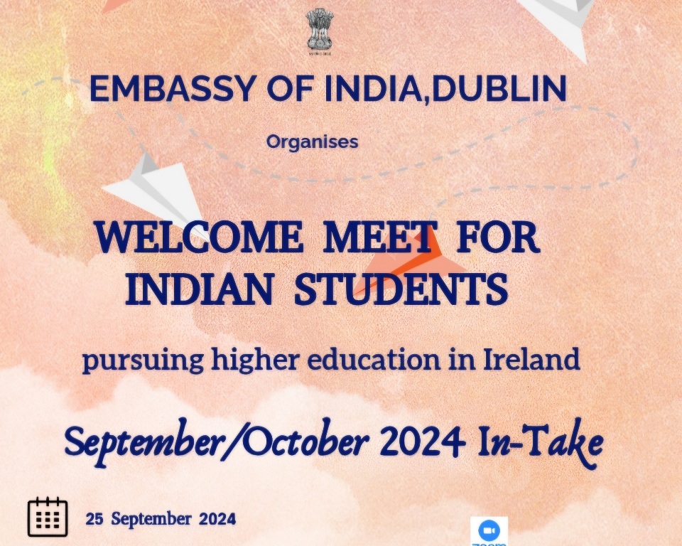 അയർലണ്ടിൽ ഉന്നത പഠനാവശ്യങ്ങൾക്ക് എത്തിയ ഇന്ത്യൻ വിദ്യാർത്ഥികളുമായി കൂടിക്കാഴ്ച ഒരുക്കി ഡബ്ലിനിലെ ഇന്ത്യൻ എംബസി. ഈ വർഷം സെപ്റ്റംബർ, ഒക്ടോബർ മാസങ്ങളിലായി അഡ്മിഷൻ എടുക്കുന്നവർക്കാണ് സെപ്റ്റംബർ 25-ന് കൂടിക്കാഴ്ച നിശ്ചയിച്ചിരിക്കുന്നത്.