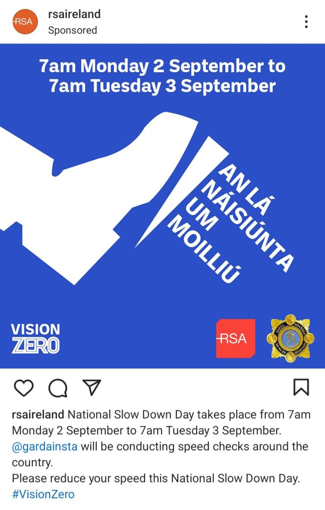 അയർലണ്ടിലെ റോഡപകടങ്ങൾ കുറയ്ക്കാനും, റോഡ് യാത്ര സുരക്ഷിതമാക്കാനും ലക്ഷ്യമിട്ട് നടത്തുന്ന National Slow Down Day നാളെ (സെപ്റ്റംബർ 2). നാളെ രാവിലെ 7 മണി മുതൽ 24 മണിക്കൂർ നേരത്തേയ്ക്കാണ് (സെപ്റ്റംബർ 3 രാവിലെ 7 മണി വരെ) Slow Down Day ആചരിക്കുക.