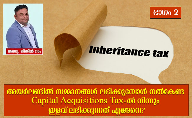 അയര്ലണ്ടില് സമ്മാനങ്ങള് ലഭിക്കുമ്പോള് നല്കേണ്ട Capital Acquisitions Tax (CAT)-ല് നിന്നും ഇളവ് ലഭിക്കുന്നത് എങ്ങനെ എന്ന് വിശദീകരിക്കുന്ന ലേഖനത്തിന്റെ രണ്ടാം ഭാഗം.