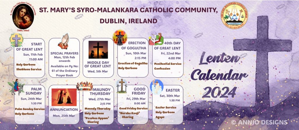 അയര്ലണ്ടിലെ സീറോ മലങ്കര സഭയിലെ നോയമ്പ് കാലത്തെ ശുശ്രൂഷകളുടെ സമയക്രമം പ്രഖ്യാപിച്ചു. ഫെബ്രുവരി 11 മുതല് ആരംഭിക്കുന്ന ശുശ്രൂഷകൾ ഈസ്റ്റര് വരെ തുടരും.
