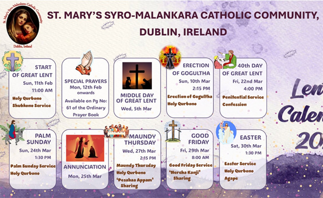 അയര്ലണ്ടിലെ സീറോ മലങ്കര സഭയിലെ നോയമ്പ് കാലത്തെ ശുശ്രൂഷകളുടെ സമയക്രമം പ്രഖ്യാപിച്ചു. ഫെബ്രുവരി 11 മുതല് ആരംഭിക്കുന്ന ശുശ്രൂഷകൾ ഈസ്റ്റര് വരെ തുടരും.