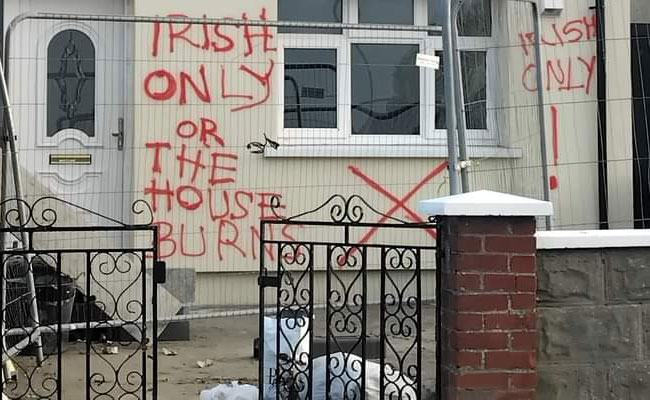 ഡബ്ലിനിലെ ഫിന്ഗ്ലാസില് സോഷ്യല് ഹൗസിങ് പദ്ധതിയില് നിര്മ്മിച്ച വീടുകളുടെ ചുമരില് വംശീയ വിദ്വേഷം നിറഞ്ഞ വാക്കുകള് എഴുതിവച്ച് അജ്ഞാതര്. പ്രദേശത്ത് ഒഴിഞ്ഞുകിടക്കുന്ന മൂന്ന് വീടുകളുടെ ചുമരിലാണ് ‘അയര്ലണ്ടുകാര്ക്ക് മാത്രം, അല്ലെങ്കില് വീടിന് തീവയ്ക്കും (Irish only or the house burns)’ എന്ന് ഗ്രാഫിറ്റി രീതിയില് എഴുതിവച്ചിരിക്കുന്നത്.