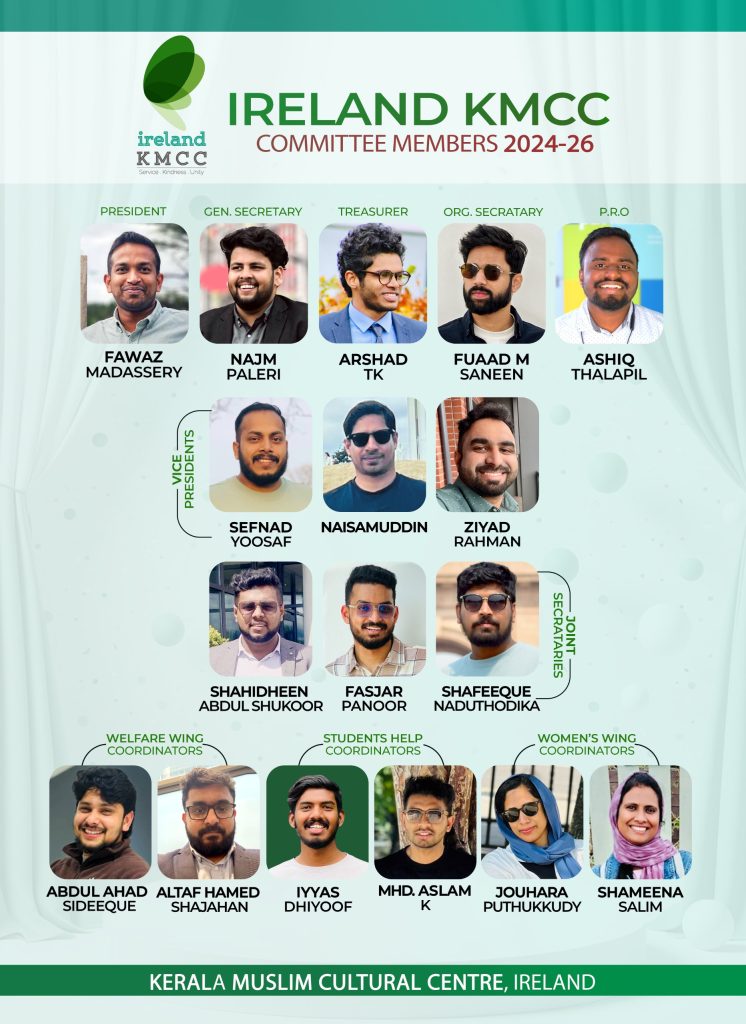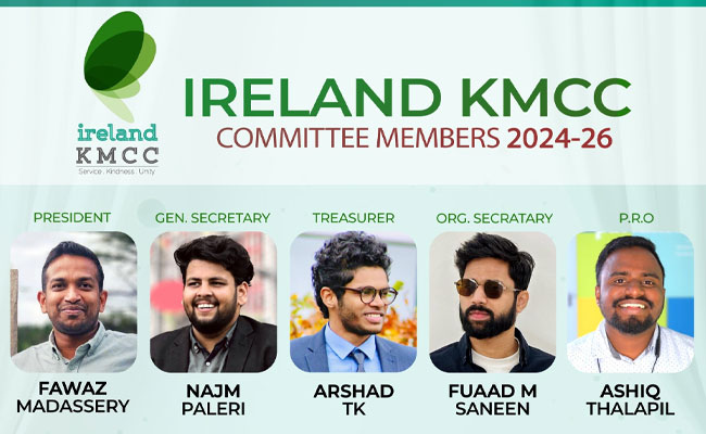 2024 ആഗസ്റ്റ് 24 ശനിയാഴ്ച ചേർന്ന ജനറൽ ബോഡി യോഗം തീരുമാനിച്ച അയർലണ്ട് കെ.എം.സി.സി 2024-26 കമ്മിറ്റിയിൽ, ഫവാസ് മാടശ്ശേരി അദ്ധ്യക്ഷനും, നജം പാലേരി ജനറൽ സെക്രട്ടറിയും, അർഷദ് ടി.കെ ട്രഷററുമായി തെരഞ്ഞെടുക്കപ്പെട്ടു.