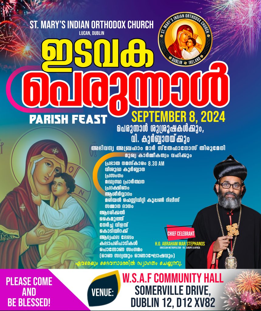 September 8 പെരുന്നാള് Venue : W.S.A.F Community Hall, Sommerville Drive, Dublin 12. D12XV82