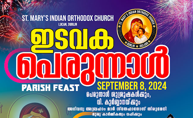 2010-ൽ വിശുദ്ധ ദൈവമാതാവിന്റെ നാമത്തില് സ്ഥാപിതമായ സെന്റ് മേരീസ് ഇന്ത്യന് ഓര്ത്തഡോക്സ് ഡബ്ലിൻ ഇടവകയുടെ പെരുന്നാളും സമൃദ്ധിയുടെയും പ്രതീക്ഷയുടെയും ഉത്സവമായ ആദ്യഫല പെരുന്നാളും (Harvest festival), മലയാളികളുടെ ദേശീയ ഉത്സവമായ ഓണവും സെപ്റ്റംബര് 8-ന് ആഘോഷിക്കുന്നു.