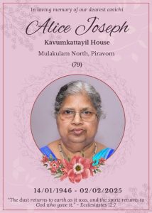 അയർലണ്ട് ബ്യൂമൗണ്ട് ഹോസ്പിറ്റലിലെ സ്റ്റാഫ് നേഴ്സ് റെനി സിബിയുടെ മാതാവ് ആലിസ് ജോസഫ് കാവുംകട്ടയിൽ (79 ) നിര്യാതയായി. സംസ്കാരം ഫെബ്രുവരി 6 ആം തീയതി 10 മണിക്ക് മുളക്കുളം സെയിന്റ് മേരീസ് പള്ളിയിൽ. ഭർത്താവ് ജോസഫ് കെ പുന്നൂസ് കേരള കോൺഗ്രസ് ജേക്കബ് പിറവം മണ്ഡലം പ്രസിഡന്റ് ആയിരുന്നു.