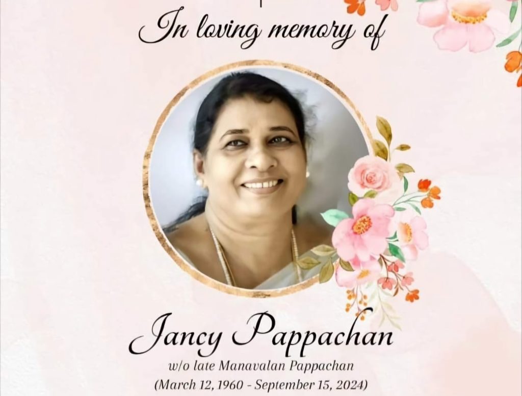 അയർലണ്ട് മലയാളിയായ മെയ്ജൻ ബേബിയുടെ ഭാര്യ സവിതയുടെ മാതാവ് ജാൻസി പാപ്പച്ചൻ (64) നിര്യാതയായി. പരേതനായ മണവാളൻ പാപ്പച്ചന്റെ ഭാര്യയാണ്. സംസ്കാരം കൗണ്ടി ലിമറിക്കിലെ Church of Saint Oliver Plunkett – ൽ സെപ്റ്റംബർ 19-ന് രാവിലെ 10.30-ന്.