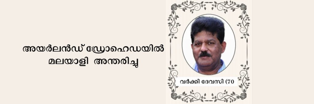 അയർലൻഡ് ഡ്രോഹെഡ ബെറ്റിസ് ടൗണിൽ താമസിക്കുന്ന കോഴിക്കാടൻ വർക്കി ദേവസി (70 -വയസ്) ഇന്ന് പുലർച്ചെ (27 നവംബർ) ഡ്രോഹെഡ ഔർ ലേഡി ഹോസ്പിറ്റലിൽ നിര്യാതനായി. വളരെ നാളുകളായി അസുഖബാധിതനായി കിടപ്പിലായിരുന്നു. സംസ്കാര ശ്രുശ്രൂഷകൾ പിന്നീട് കേരളത്തിൽ.