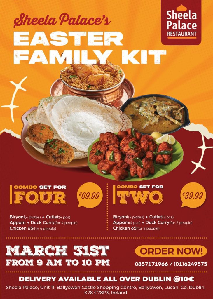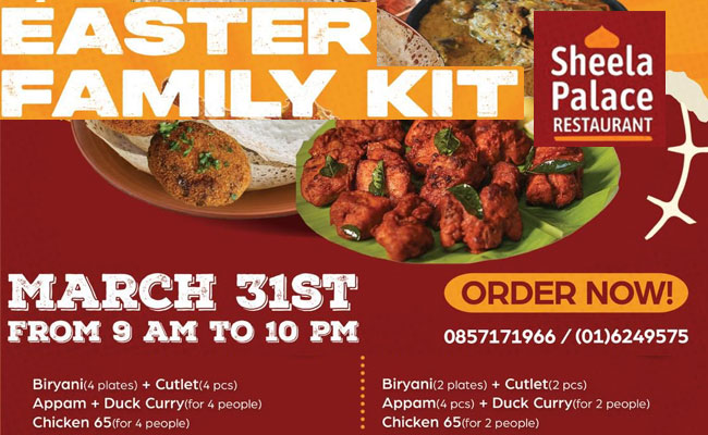ഈസ്റ്ററിന് വമ്പന് ഓഫറുമായി മലയാളികളുടെ സ്വന്തം ഷീലാ പാലസ് റസ്റ്ററന്റ്. മാര്ച്ച് 31 ഈസ്റ്റര് നാള് ആഘോഷമാക്കാനായി രണ്ട് കോംബോ ഫാമിലി കിറ്റ് ഓഫറുകളാണ് ലഭ്യമാക്കിയിട്ടുള്ളത്.