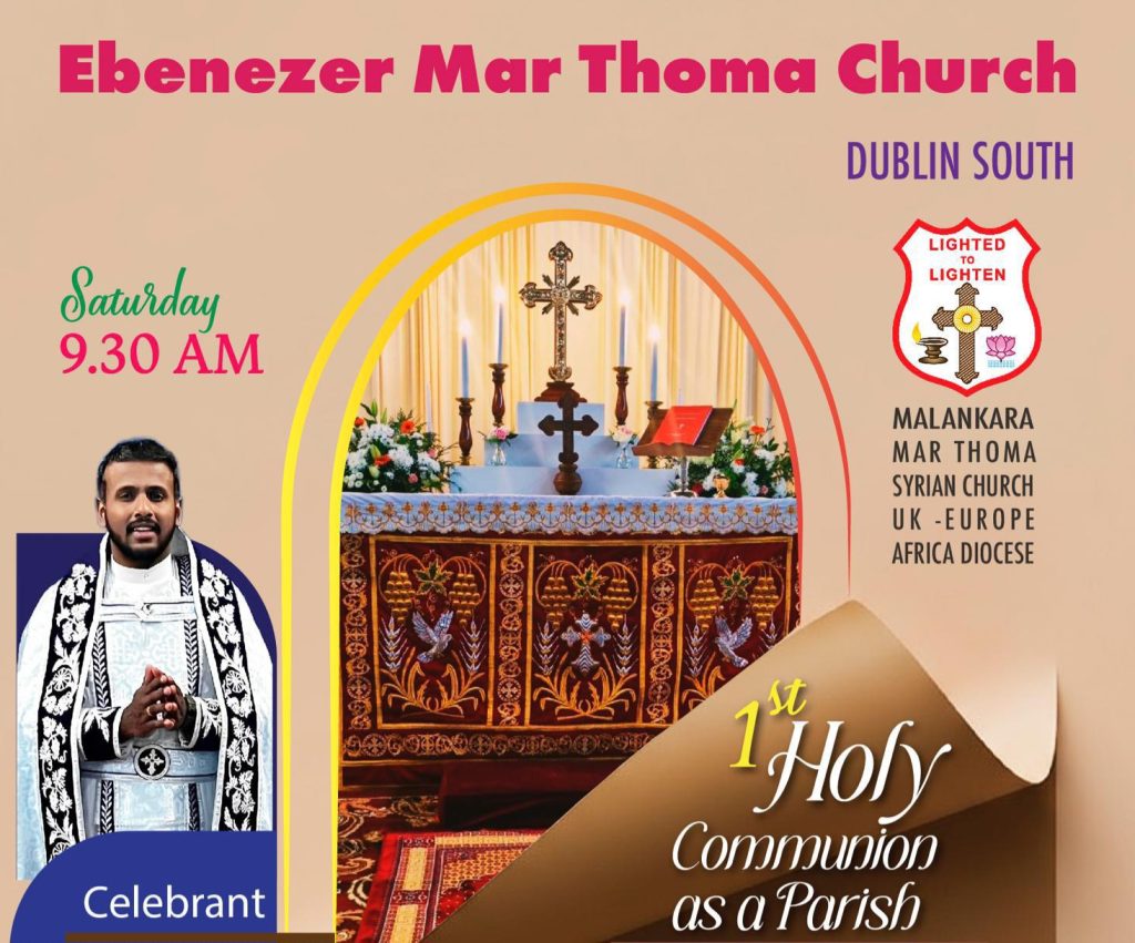 ഡബ്ലിൻ: അയർലണ്ടിലെ രണ്ടാമത്തെ മാർത്തോമ്മാ പള്ളിയായി ഉയർത്തപ്പെട്ട “എബനേസർ മാർത്തോമ്മാ ചർച്ച് ഡബ്ലിൻ സൗത്തിന്റെ” ആദ്യ വിശുദ്ധ കുർബാന ഒക്ടോബർ മാസം 18-ാംതീയതി ശനിയാഴ്ച്ച രാവിലെ 9:30-ന് ഗ്രേസ്റ്റോൺസിലുള്ള Nazarene Community Church, Greystones, Wicklow, A63YD27 വെച്ച് നടത്തപ്പെടുന്നു.