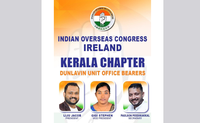ഡബ്ലിൻ: ഇന്ത്യൻ ഓവർസീസ് കോൺഗ്രസ് (IOC) അയർലണ്ട് – കേരള ചാപ്റ്റർ ഡൺലാവിൻ യൂണിറ്റിന്റെ പുതിയ ഭാരവാഹികളെ തെരഞ്ഞെടുത്തതായി ഐഒസി നാഷണൽ പ്രസിഡന്റ് ലിങ്ക് വിൻസ്റ്റാർ മാത്യു അറിയിച്ചു.