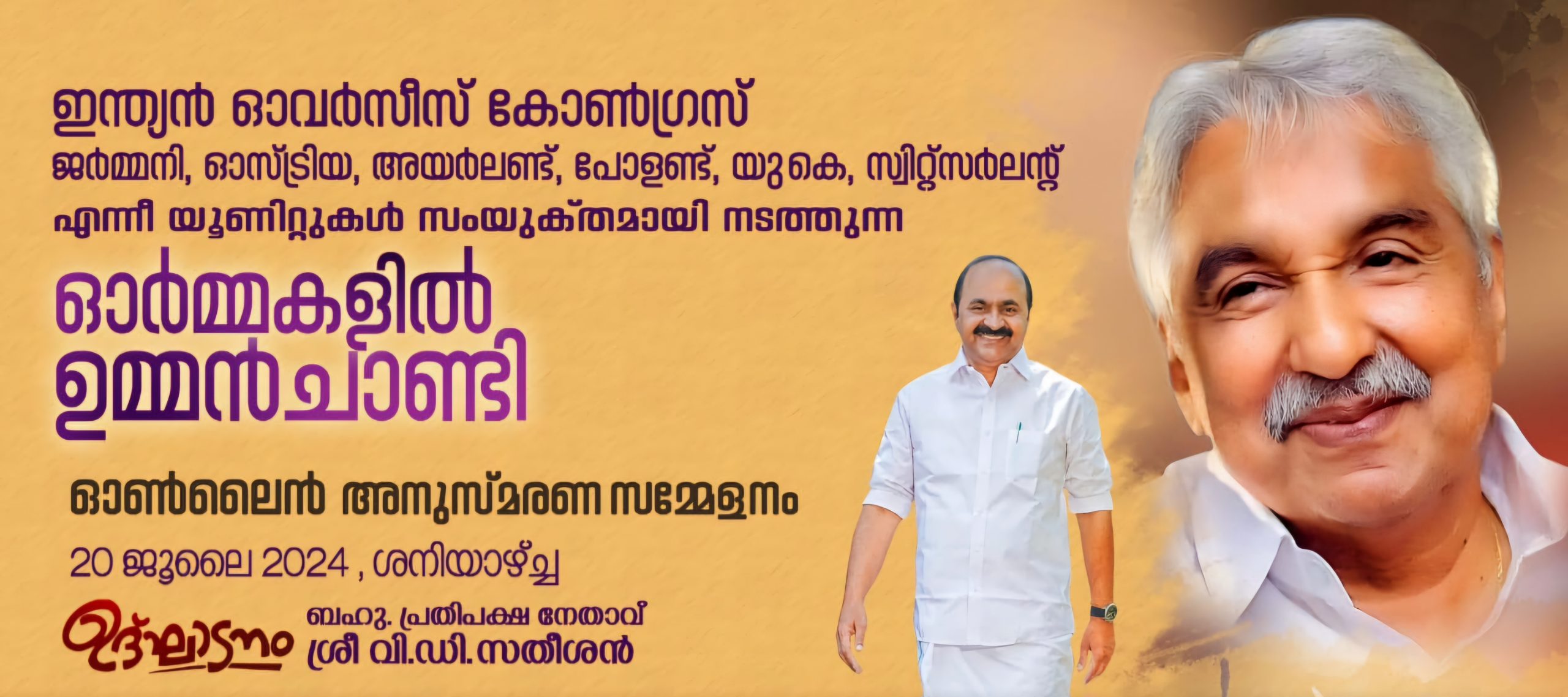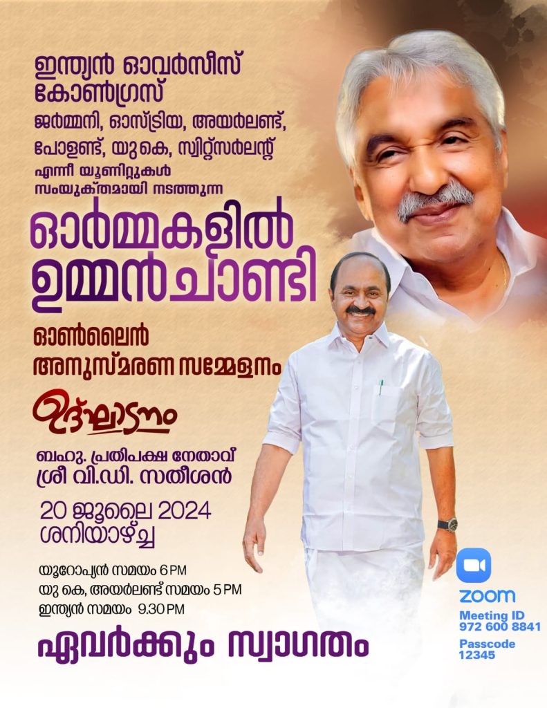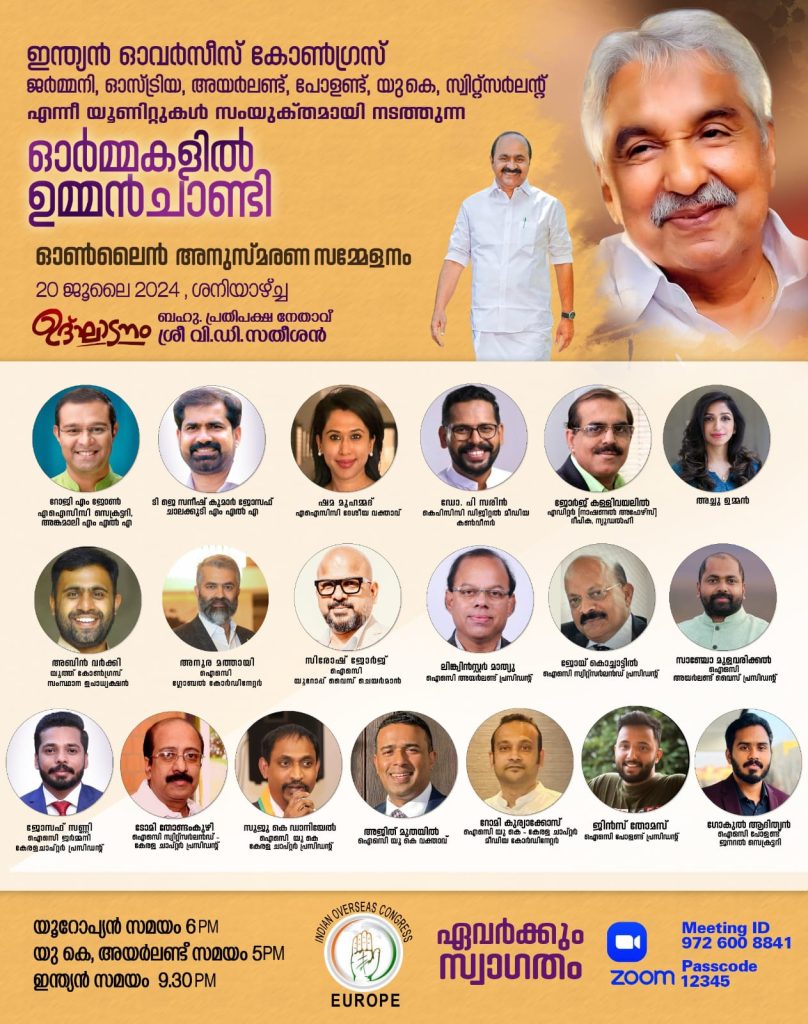 യൂറോപ്പ്: കേരള രാഷ്ട്രീയത്തിലെ ജനകീയ മുഖവും സൗമ്യതയുടേയും ജനപ്രീയതയുടെയും പ്രതീകവുമായിരുന്ന ശ്രീ. ഉമ്മൻ ചാണ്ടിയുടെ ജ്വലിക്കുന്ന സ്മരണകൾക്ക് മുന്നിൽ പ്രണാമം അർപ്പിച്ചുകൊണ്ട്, ഇന്ത്യൻ ഓവർസീസ് കോൺഗ്രസ് (ഐഒസി) ജർമ്മനി, യു കെ, ഓസ്ട്രിയ, സ്വിറ്റ്സർലഡ്, പോളണ്ട് തുടങ്ങിയ യൂണിറ്റുകളുടെ ആഭിമുഖ്യത്തിൽ വിപുലമായ അനുസ്മരണ ചടങ്ങുകൾ സംഘടിപ്പിക്കുന്നു. ഓൺലൈൻ പ്ലാറ്റ്ഫോമായ സൂം (ZOOM) മുഖേന, ജൂലൈ 20 (ശനിയാഴ്ച) യൂറോപ് സമയം 6 PM, യു കെ – അയർലണ്ട് സമയം 5 PM, ഇന്ത്യൻ സമയം 9.30 PM – ന് ആണ് “ഓർമകളിൽ ഉമ്മൻ ചാണ്ടി” എന്ന തലക്കെട്ടിൽ അനുസ്മരണ ചടങ്ങ് സംഘടിപ്പിക്കുന്നത്.