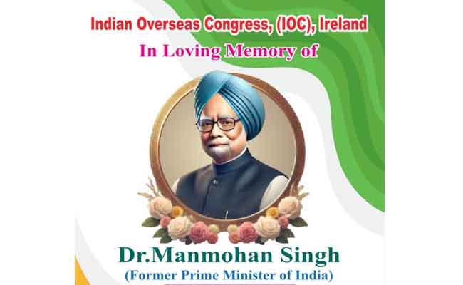 ഇന്ത്യൻ ഓവർസീസ് കോൺഗ്രസ് അയർലണ്ടിന്റെ നേതൃത്വത്തിൽ, ഇന്ത്യൻ പ്രധാന മന്ത്രിയായിരുന്ന, സാമ്പത്തിക വിദഗ്ദ്ധനുമായിരുന്ന, ഡോക്ടർ മൻമോഹൻ സിങിന്റെ നിര്യാണത്തിലുള്ള അനുസ്മരണ യോഗം ജനുവരി 26-)o തീയതി ഞായറാഴ്ച 2:30 pm ന് ഡബ്ലിൻ ലൂക്കാന് സമീപമുള്ള ഷീല പാലസിൽ (Upstairs) കൂടുന്നു. എല്ലാവരെയും യോഗത്തിലേക്ക് സ്വാഗതം ചെയ്യുന്നതായി ഐ ഓ സീ അയർലണ്ട് ഭാരവാഹികൾ അറിയിച്ചു.