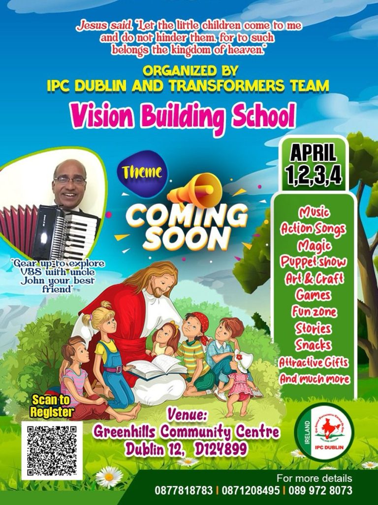 ഡബ്ലിൻ: ഐ പി സി ഡബ്ലിൻ സഭയും ട്രാൻസ്ഫോർമേഴ്സ് ടീമും ചേർന്നൊരുക്കുന്ന കുട്ടികൾക്കായുള്ള വി ബി സ് 2024 ഏപ്രിൽ 1 മുതൽ 4 വരെ തീയതികളിൽ രാവിലെ 10 മുതൽ ഉച്ചക്ക് 1 മണി വരെ ഗ്രീൻഹിൽസ് കമ്മ്യൂണിറ്റി സെന്റെറിൽ വച്ചു നടക്കുന്നു.