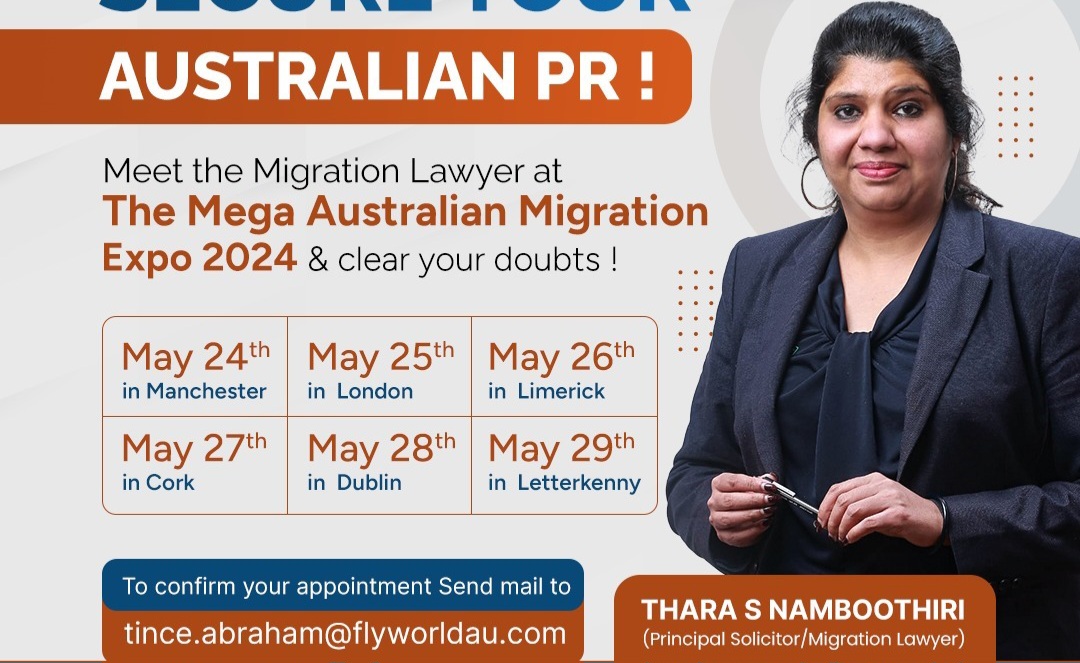ഓസ്ട്രേലിയയിലേക്ക് മൈഗ്രേറ്റ് ചെയ്യാൻ യോഗ്യരായവർക്ക് ഏറ്റവും മികച്ച ഒരു അവസരം ഒരുക്കുകയാണ് ഫ്ലൈ വേൾഡ് എക്സ്പോയിലൂടെ. പ്രവേശനം തികച്ചും സൗജന്യമായ ഈ എക്സ്പോയിൽ നിങ്ങൾക്ക് മൈഗ്രേഷൻ ലോയറോട് നേരിട്ട് സംശയങ്ങൾ ചോദിച്ച് മനസ്സിലാക്കാനുള്ള അവസരം ഉണ്ടായിരിക്കുന്നതാണ്. സ്കിൽഡ് പ്രൊഫഷനൻസിന് ഓസ്ട്രേലിയയിൽ സാധ്യമായ തൊഴിലവസരങ്ങളെക്കുറിച്ചും പി ആർ കരസ്ഥമാക്കാനുള്ള എളുപ്പവഴികളെക്കുറിച്ചും താര എസ് നമ്പൂതിരി ജനങ്ങളോട് നേരിട്ട് സംവദിക്കുന്നതായിരിക്കും.