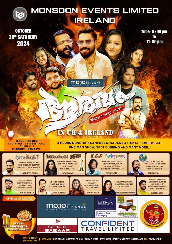 അടുത്തമാസം ഒക്ടോബർ 26-ന് കിൽക്കനിയിലെ The Hub – Cillin Hill ഹാളിൽ വെച്ച് നടക്കുന്ന ഈ മെഗാഷോയിൽ ഗിന്നസ് പക്രുവിനൊപ്പം പ്രശസ്ത പിന്നണി ചലച്ചിത്ര ഗായിക നയന നായർ, പിന്നണി ഗായകൻ ശ്രീ. വിപിൻ സേവ്യർ, ഐഡിയ സ്റ്റാർ സിംഗർ ഫെയിം അരുൺ ഗോപൻ, മിമിക്രി ആർട്ടിസ്റ്റ് റെജി രാമപുരം, അജീഷ് കോട്ടയം തുടങ്ങി മലയാള സിനിമാ-സ്റ്റേജ് ഷോ വേദികളിലെ പ്രഗൽഭരായ കലാകാരന്മാർ അണിനിരക്കുന്നു.