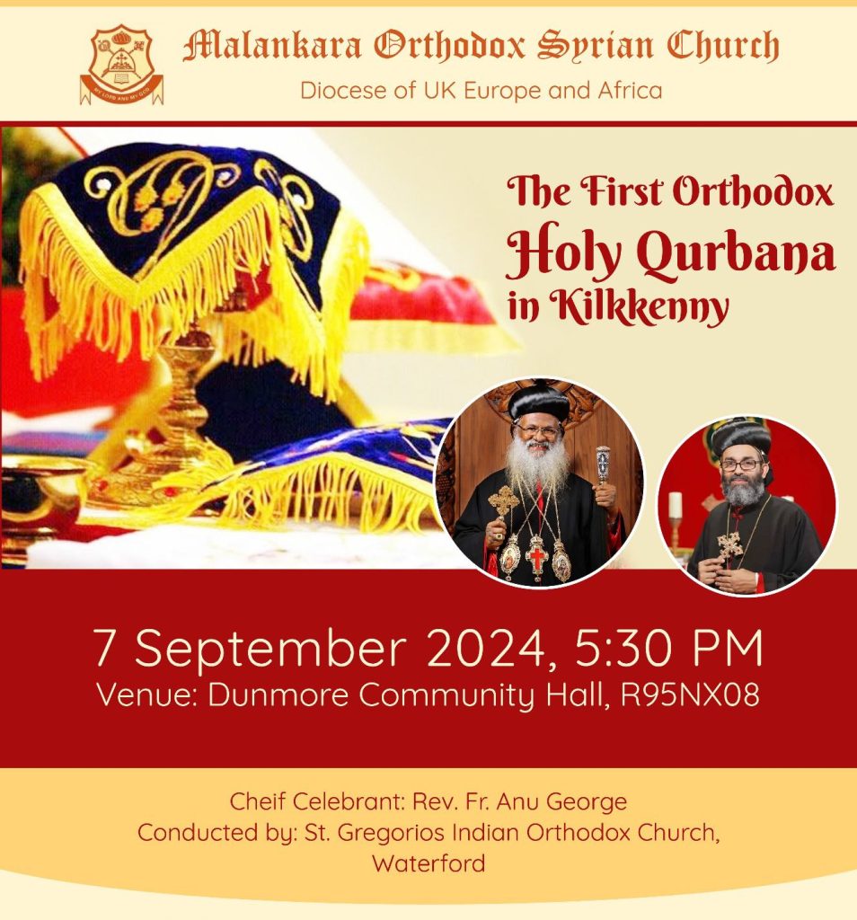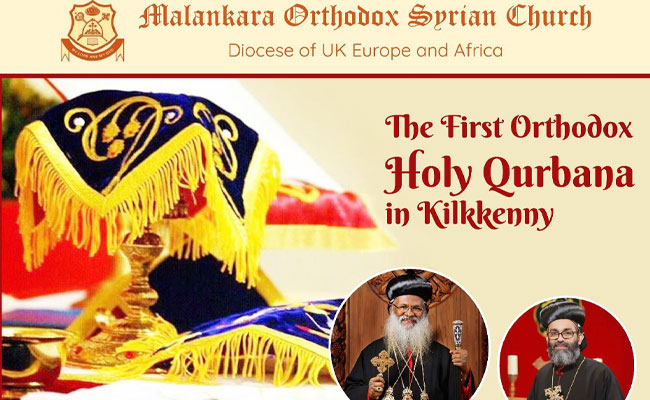 മലങ്കര ഓർത്തഡോക്സ് സിറിയൻ സഭയുടെ യു.കെ, യൂറോപ്പ്, ആഫ്രിക്ക ഭദ്രാസനത്തിന്റെ കീഴിലുള്ള അയർലണ്ടിലെ കിൽകെനിയിൽ ആദ്യമായി വിശുദ്ധ കുർബാന നടത്തപെടുന്നു. ഈ ശനിയാഴ്ച സെപ്റ്റംബർ 7-ന്, വൈകിട്ട് 5:30-ന് കിൽകെനി ഡൺമോർ കമ്മ്യൂണിറ്റി ഹാളിൽ വച്ച് വിശുദ്ധ കുർബാന അർപ്പിക്കുന്നു.
