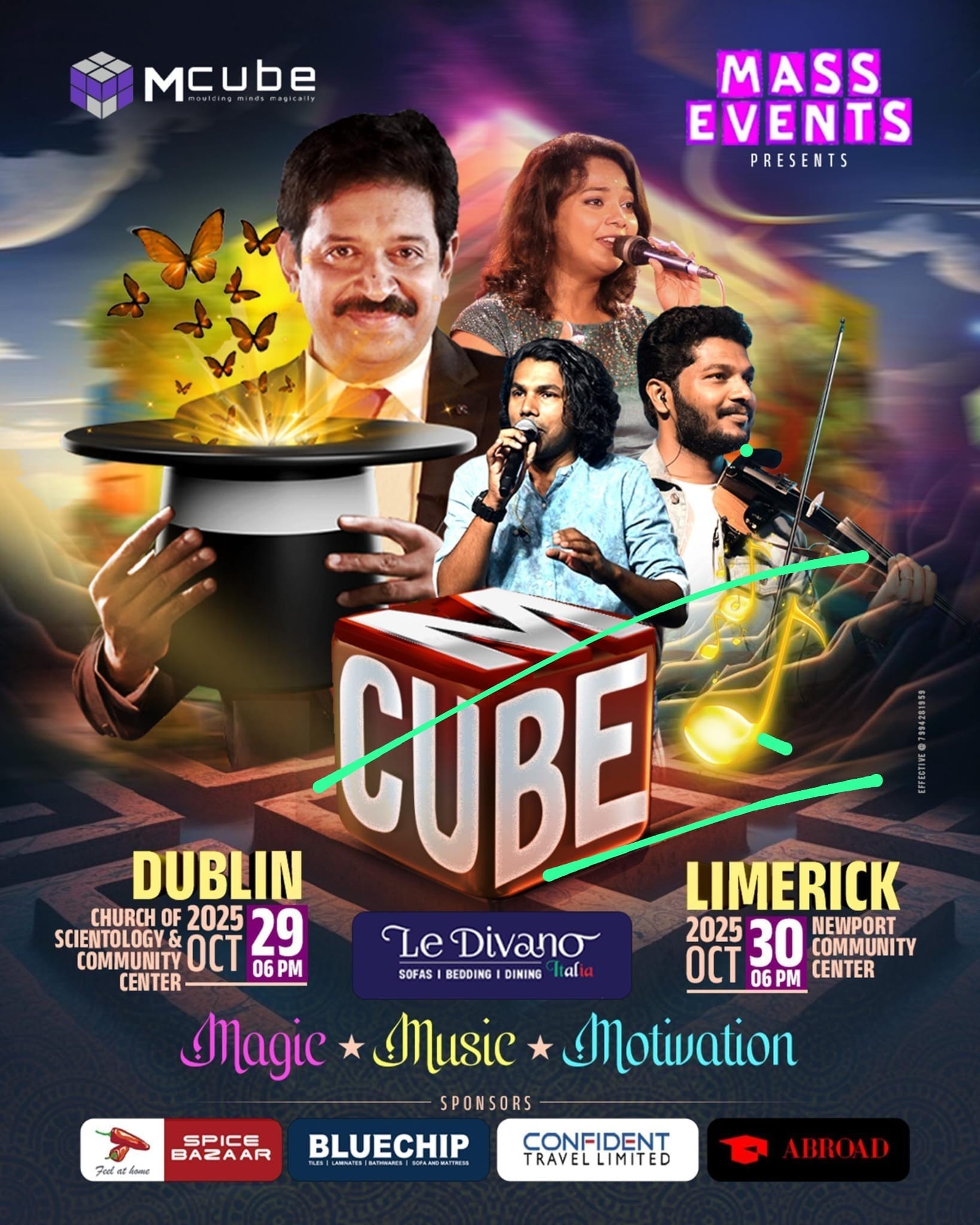Le Divano -യും മാസ്സ് ഇവന്റസും ചേർന്നവതരിപ്പിക്കുന്ന പ്രശസ്ത മജീഷ്യൻ ഗോപിനാഥ് മുതുകാടിൻറെ നേതൃത്വത്തിൽ മെഗാ സംഗീത മാജിക്ക് ഷോ – ‘Mcube’ ഡബ്ലിനിലും ലീമെറിക്കിലും അരങ്ങേറും.