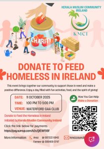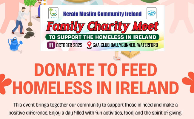 കേരളാ മുസ്ലിം കമ്മ്യൂണിറ്റി അയര്ലണ്ട് സംഘടിപ്പിക്കുന്ന ‘Donate to Feed the Homeless in Ireland’ ചാരിറ്റി പരിപാടി ഒക്ടോബര് 11-ന് പകല് 1 മണി മുതല് 5 മണി വരെ വാട്ടര്ഫോര്ഡിലെ ബാലിഗണ്ണറിലുള്ള ജിഎഎ ക്ലബ്ബില് നടക്കും. രാജ്യത്തെ ഭവനരഹിതര്ക്ക് ഭക്ഷണം നല്കാനായി പണം സ്വരൂപിക്കുക എന്ന ഉദ്ദേശ്യത്തോടെ നടത്തപ്പെടുന്ന ഫാമിലി ചാരിറ്റി മീറ്റിന്, Helping Hand Waterford-ന്റെ പിന്തുണയുമുണ്ട്.