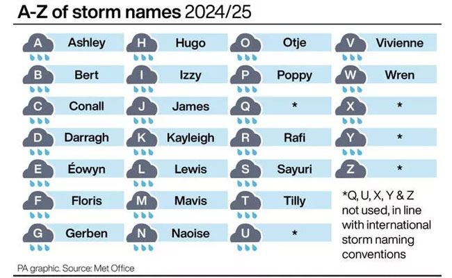 2024-25 വര്ഷങ്ങളിലെ കൊടുങ്കാറ്റുകളുടെ പേരുകള് ഇപ്രകാരമാണ്: Ashley, Bert, Conall, Darragh, Eowyn, Floris, Gerben, Hugo, Izzy, James, Kayleigh, Lewis, Mavis, Naoise, Otje, Poppy, Rafi, Sayuri, Tilly, Vivienne, Wren. ഇതില് Conall, Darragh, Hugo, Izzy, Naoise, Poppy, Vivienne എന്നീ പേരുകളാണ് അയര്ലണ്ടിന്റെ സംഭാവന.