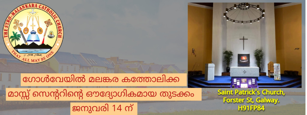 അയർലണ്ടിലെ മലങ്കര കത്തോലിക്ക സഭയുടെ ഗാൽവേയിലെ കുർബാന സെന്റർ 2024 ജനുവരി 14 നു ഞായറാഴ്ച 2:00 മണിക്ക് ഗാൽവേ, ഫോർസ്റ്റർ സ്ട്രീറ്റിലുള്ള സെന്റ് പാട്രിക് ദൈവാലയത്തിൽ വെച്ച് സീറോ മലങ്കര കത്തോലിക്കാ സഭയുടെ അയർലണ്ട് കോർഡിനേറ്റർ ഫാ. ചെറിയാൻ താഴമണ്ണിന്റെ മുഖ്യ കാർമ്മികത്വത്തിലും,