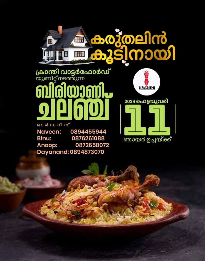 ബിരിയാണി വിതരണം ചെയ്യപ്പെടുന്നത്. അയർലണ്ടിലെ പ്രശസ്തമായ ഡെലിഷ്യ കാറ്ററിംഗ് തയ്യാറാക്കുന്ന സ്വാദിഷ്ടമായ ബിരിയാണി, ക്രാന്തിയുടെ പ്രവർത്തകർ നേരിട്ട് വീടുകളിൽ എത്തിക്കുന്നതാണ്. ബിരിയാണി ഓർഡറുകൾ സ്വീകരിക്കുന്ന അവസാന തീയതി ഫെബ്രുവരി 9. പരിപാടിയുടെ വിജയത്തിനായി എല്ലാവരുടെയും സഹകരണവും സഹായവും യൂണിറ്റ് കമ്മിറ്റി അഭ്യർത്ഥിച്ചു.