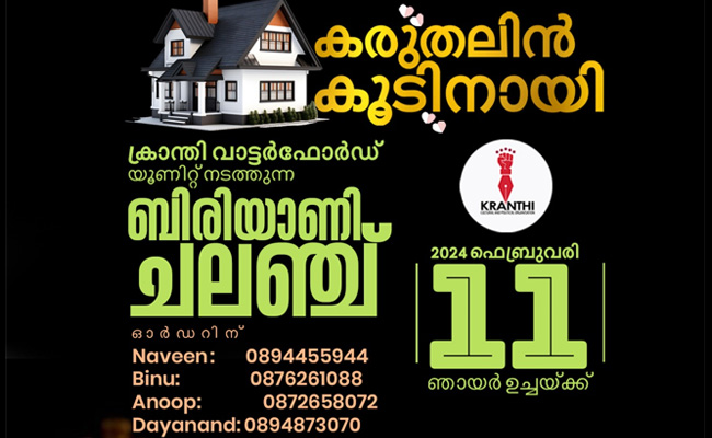 വാട്ടർഫോർഡ്: കേരളത്തിലെ നിർധനരായ ഒരു കുടുംബത്തിന് വീട് നിർമ്മിച്ചു നൽകുന്ന ക്രാന്തിയുടെ ഭവനനിർമ്മാണ പദ്ധതിയുടെ ധനശേഖരണാർത്ഥം ക്രാന്തി വാട്ടർഫോർഡ് യൂണിറ്റ് ബിരിയാണി ചലഞ്ച് സംഘടിപ്പിക്കുന്നു. ‘കരുതലിൻ കൂട്’ എന്ന പദ്ധതിക്ക് ഉടുമ്പൻ ചോല എംഎൽഎയും മുൻ കേരള വൈദ്യുത വകുപ്പ് മന്ത്രിയുമായിരുന്ന എം.എം മണി നേരത്തെ തുടക്കം കുറിച്ചിരുന്നു.