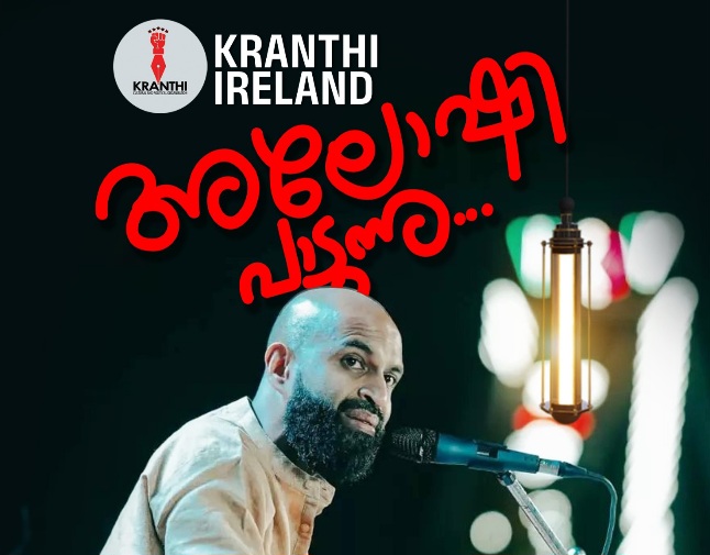 അലോഷി ആദംസിന്റെ മാന്ത്രിക ഗസലുകൾ ആസ്വദിക്കാനുള്ള അപൂർവ്വ അവസരത്തിലേക്ക് ഏവരെയും ക്രാന്തി കമ്മിറ്റി സ്നേഹത്തോടെ സ്വാഗതം ചെയ്യുന്നു. പരിപാടിയുടെ വിശദമായ വിവരങ്ങൾ ഉടൻതന്നെ അറിയിക്കുന്നതാണ്.