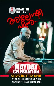 ഡബ്ലിൻ: ക്രാന്തിയുടെ ആഭിമുഖ്യത്തിൽ സംഘടിപ്പിക്കുന്ന മെയ്ദിനാഘോഷ പരിപാടികൾക്ക് മാറ്റുകൂട്ടുവാൻ പ്രശസ്ത ഗസൽ – പിന്നണി ഗായകൻ അലോഷി ആദംസിന്റെ ഹൃദയഹാരിയായ ഗസൽ സന്ധ്യ അരങ്ങേറുന്നു.