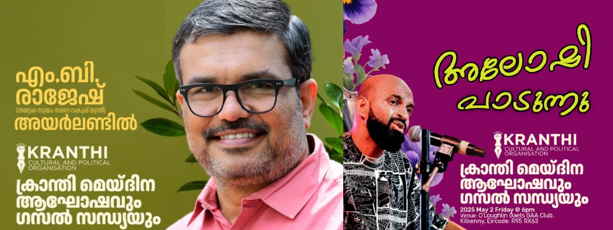 മെയ്ദിന പരിപാടികൾക്ക് തയ്യാറെടുക്കുകയാണ്. അയർലണ്ടിൽ ക്രാന്തിയുടെ നേതൃത്വത്തിൽ വിപുലമായ പരിപാടികളോടുകൂടി മെയ്ദിന പരിപാടികൾ മെയ് രണ്ടിന് സംഘടിപ്പിക്കുന്നു.കേരള സംസ്ഥാന തദ്ദേശ സ്വയംഭരണ, എക്സൈസ്, പാർലമെൻററി കാര്യവകുപ്പ് മന്ത്രി എം. ബി രാജേഷ് ക്രാന്തിയുടെ മെയ്ദിന പരിപാടിയിൽ മുഖ്യാതിഥിയായി പങ്കെടുക്കും. മെയ് രണ്ടിന് വൈകിട്ട് ആറുമണിക്കാണ് പരിപാടികൾ ആരംഭിക്കുന്നത്.