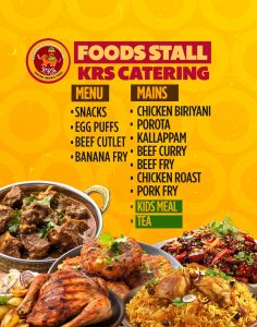 ഐറിഷ് മലയാളികൾക്ക് ഏറെ പ്രിയപ്പെട്ട KRS കാറ്ററിംഗ് ഗ്രൂപ്പിൻറെ രുചികരമായ നാടൻ ഭക്ഷണശാലയും പരിപാടിക്കായി എത്തുന്നവർക്കായി ഒരുക്കിയിട്ടുണ്ട്.പപ്സും പഴംപൊരിയും ബീഫ് കട്ട്ലെറ്റും ഉൾപ്പെടുന്ന സ്നാക്സും ചിക്കൻ ബിരിയാണിയും കള്ളപ്പവും ബീഫ് കറിയും ചിക്കൻ കറിയും പോർക്ക് ഫ്രൈ തുടങ്ങി നാവിൽ കൊതിയൂറും വിഭവങ്ങൾ മിതമായ നിരക്കിൽ KRS കാറ്ററിംഗ് ഒരുക്കുന്നുണ്ട്.കുട്ടികൾക്ക് പ്രത്യേക കിഡ്സ് മീലും ലഭ്യമാണ്.