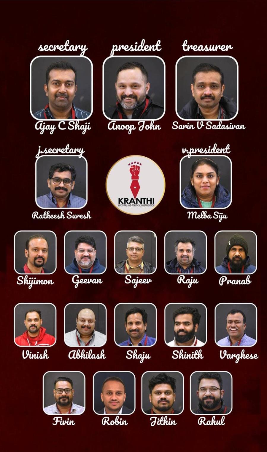 കേന്ദ്ര കമ്മിറ്റി അംഗങ്ങൾ- പ്രണാബ് കുമാർ, റോബിൻ ജോസഫ്, വിനീഷ് വി.കെ. ജിത്തിൻ റാഷിദ്,രാഹുൽ രവീന്ദ്രൻ, ഫിവിന് തോമസ്,സജീവ് നാരായൺ, ഷിനിത്ത് എ കെ, വര്ഗീസ് ജോയ്,ജീവൻ മാടപ്പാട്ട്,ഷിജിമോൻ കച്ചേരിയിൽ, രാജു ജോർജ്, ഷാജു ജോസ്, അഭിലാഷ് തോമസ്.