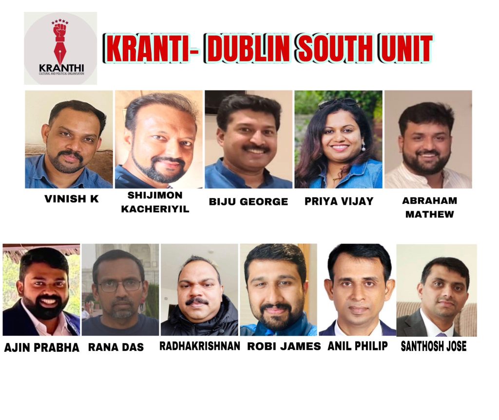 ഡബ്ലിൻ: അയർലണ്ടിലെ പുരോഗമന രാഷ്ട്രീയ-സാംസ്കാരിക സംഘടനയായ ക്രാന്തിയുടെ ഡബ്ലിൻ സൗത്ത് യൂണിറ്റ് വാർഷിക സമ്മേളനം 24/11/2024 ഞായറാഴ്ച ഡബ്ലിൻ 22-വിൽ വെച്ച് നടന്നു. ക്രാന്തിയുടെ കേന്ദ്ര കമ്മിറ്റി പ്രസിഡന്റ് ശ്രീ. മനോജ് ഡി മാന്നാത്ത് സമ്മേളനം ഉത്ഘാടനം ചെയ്തു. കേന്ദ്ര കമ്മിറ്റി സെക്രട്ടറി ശ്രീ. ഷിനിത്ത്, കേന്ദ്ര കമ്മിറ്റി ട്രഷറർ ശ്രീ. ജോൺ ചാക്കോ എന്നിവർ സമ്മേളനത്തെ അഭിവാദ്യം ചെയ്ത് സംസാരിച്ചു.