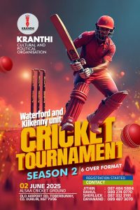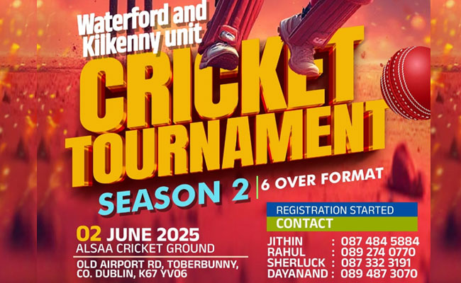 ഡബ്ലിൻ : അയർലണ്ടിലെ ക്രിക്കറ്റ് പ്രേമികൾക്കായി ക്രാന്തിയുടെ വാട്ടർഫോർഡ്, കിൽക്കെനി യൂണിറ്റുകൾ സംയുക്തമായി ക്രിക്കറ്റ് ടൂർണമെന്റ് സംഘടിപ്പിക്കുന്നു. ജൂൺ 2-ന് നടത്തുന്ന മത്സരങ്ങളുടെ രജിസ്ട്രേഷൻ ആരംഭിച്ചു കഴിഞ്ഞു. ഡബ്ലിനിലെ അൽസാ ക്രിക്കറ്റ് ഗ്രൗണ്ടാണ് ആവേശകരമായ പോരാട്ടങ്ങൾക്ക് വേദിയാകുന്നത്.