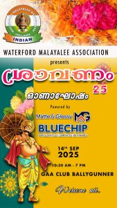 പ്രവാസി മലയാളികളുടെ കൂട്ടായ്മയായ വാട്ടർഫോർഡ് മലയാളി അസോസിയേഷൻ്റെ (WMA) ഈ വർഷത്തെ ഓണാഘോഷമായ ‘ശ്രാവണം-25’ വർണ്ണാഭമായ പരിപാടികളോടെ നാളെ (സെപ്റ്റംബർ 14 ഞായറാഴ്ച) നടക്കും. വാട്ടർഫോർഡ് ബാലിഗണർ GAA ക്ലബ്ബ് ഇൻഡോർ സ്റ്റേഡിയത്തിൽ അരങ്ങേറുന്ന ആഘോഷപരിപാടികൾ, നാടിൻ്റെ തനിമയും കൂട്ടായ്മയുടെ ഊഷ്മളതയും വിളിച്ചോതുന്ന സാംസ്കാരിക വിരുന്നാകും. WMA-യുടെ പതിനെട്ടാമത് ഓണാഘോഷം എന്ന പ്രത്യേകതയും ഇത്തവണത്തെ പരിപാടികൾക്കുണ്ട്.