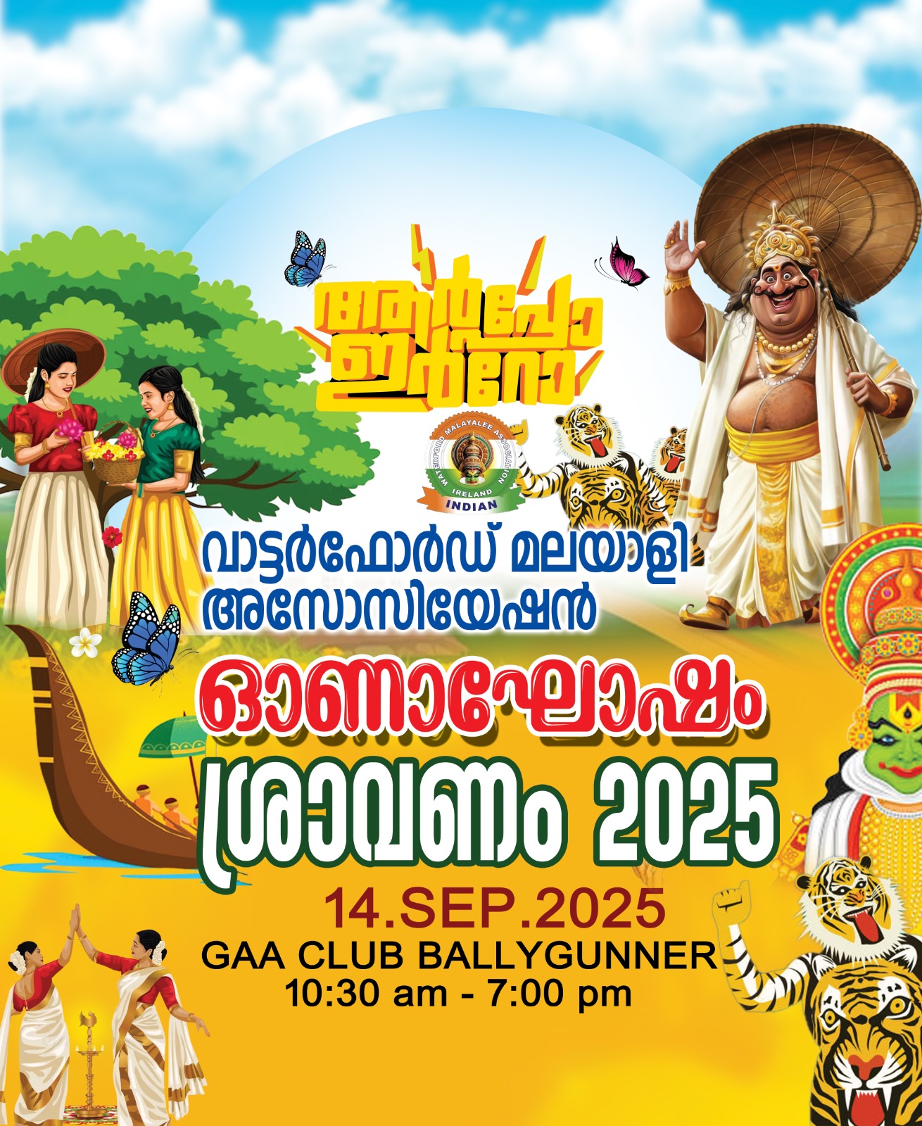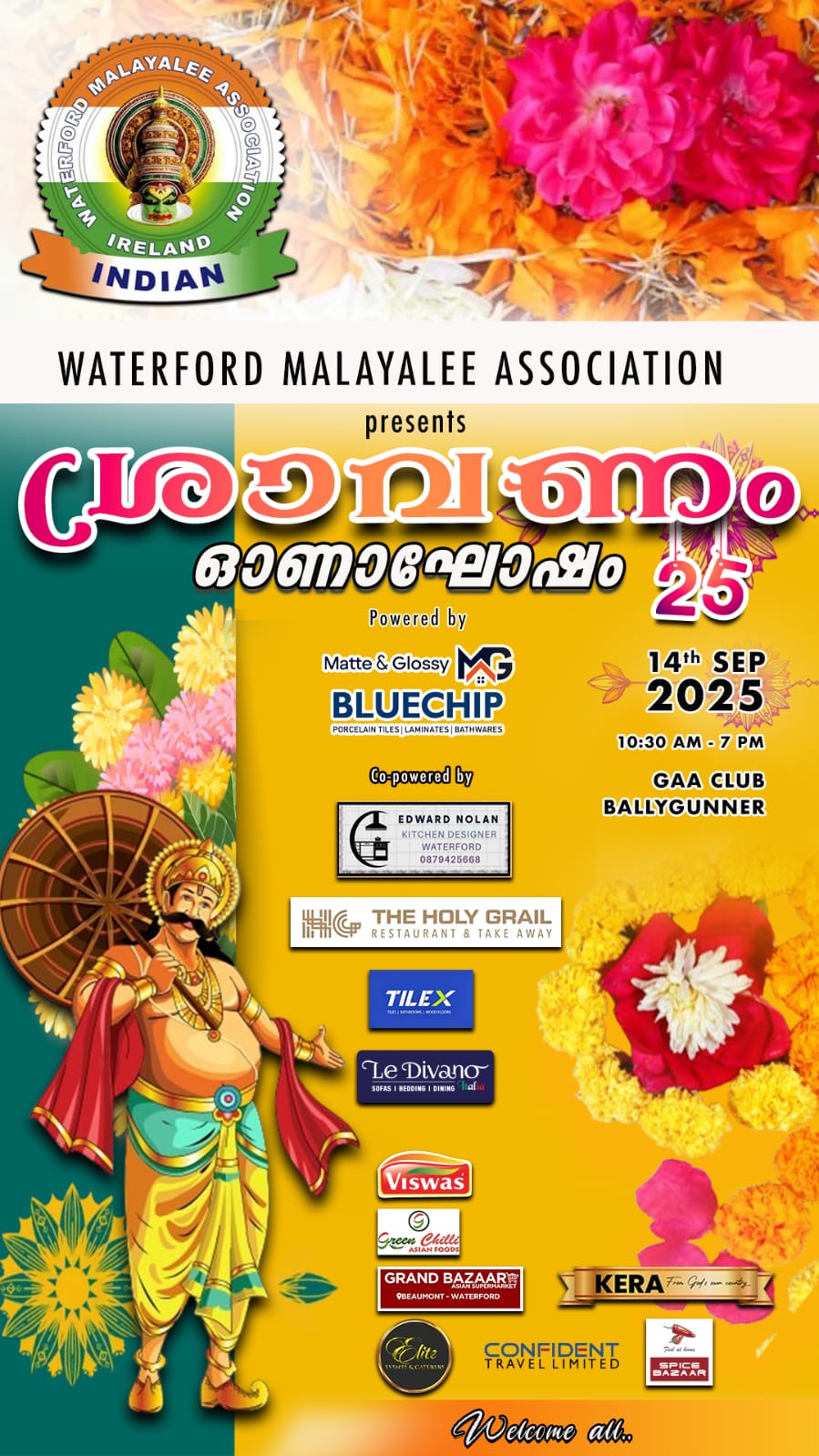 പ്രവാസി മലയാളികളുടെ കൂട്ടായ്മയായ വാട്ടർഫോർഡ് മലയാളി അസോസിയേഷൻ്റെ (WMA) ഈ വർഷത്തെ ഓണാഘോഷമായ ‘ശ്രാവണം-25’ വർണ്ണാഭമായ പരിപാടികളോടെ നാളെ (സെപ്റ്റംബർ 14 ഞായറാഴ്ച) നടക്കും. വാട്ടർഫോർഡ് ബാലിഗണർ GAA ക്ലബ്ബ് ഇൻഡോർ സ്റ്റേഡിയത്തിൽ അരങ്ങേറുന്ന ആഘോഷപരിപാടികൾ, നാടിൻ്റെ തനിമയും കൂട്ടായ്മയുടെ ഊഷ്മളതയും വിളിച്ചോതുന്ന സാംസ്കാരിക വിരുന്നാകും. WMA-യുടെ പതിനെട്ടാമത് ഓണാഘോഷം എന്ന പ്രത്യേകതയും ഇത്തവണത്തെ പരിപാടികൾക്കുണ്ട്.