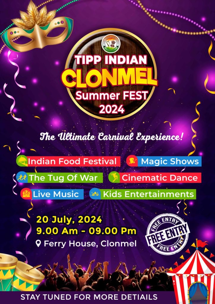 County Tipperary-യിലെ ക്ലോൺമലിൽ ജൂലൈ 20-ആം തീയതി സമ്മർ ഫെസ്റ്റ് നടത്തപ്പെടുന്നു. Tipperary-യിലെ ഇന്ത്യക്കാരുടെ സംഘടനയായ ടിപ്പ് ഇന്ത്യൻ കമ്മ്യൂണിറ്റിയാണ് ‘Clonmel Summer Fest 2024’ അണിയിച്ചൊരുക്കുന്നത്.