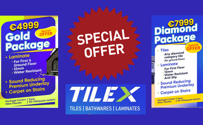 അയര്ലണ്ടിലെ പ്രശസ്ത ടൈല്സ് ഷോറൂമായ Tilex-ല് വമ്പന് ഡിസ്കൗണ്ട് മേള. ഗോള്ഡ് പാക്കേജ്, ഡയമണ്ട് പാക്കേജ് എന്നിങ്ങനെ രണ്ട് വ്യത്യസ്ത ഓഫര് പാക്കേജുകളാണ് Tilex ഉപഭോക്താക്കള്ക്കായി ഒരുക്കിയിട്ടുള്ളത്.