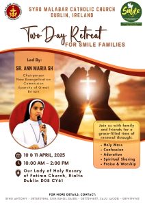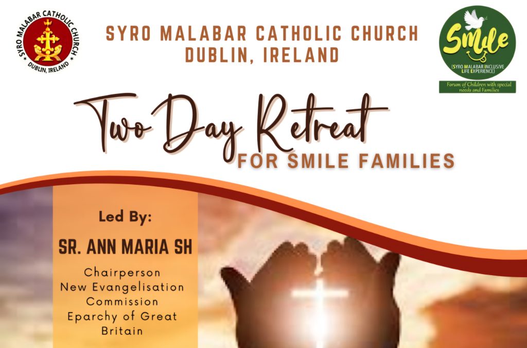 ഡബ്ലിൻ: അയർലണ്ട് സീറോ മലബാർ സഭയുടെ സമാവകാശ പരിരക്ഷ വിഭാഗമായ സ്മൈൽ (SMILE) സംഘടിപ്പിക്കുന്ന ദ്വിദിന ധ്യാനം ഏപ്രിൽ 10, 11 തീയതികളിൽ (വ്യാഴം, വെള്ളി) നടത്തപ്പെടുന്നു. സ്പെഷ്യൽ നീഡ്സ് ഉള്ള കുട്ടികൾക്കും അവരുടെ കുടുംബാംഗങ്ങൾക്കുമായി നടത്തപ്പെടുന്ന പ്രസ്തുത ധ്യാനം രാവിലെ പത്ത് മുതൽ ഉച്ചകഴിഞ്ഞ് രണ്ടുമണി വരെയാണ് ക്രമീകരിച്ചിരിക്കുന്നത്. ഗ്രേറ്റ് ബ്രിട്ടൻ സീറോ മലബാർ രൂപതയുടെ ഇവാഞ്ചലിസെഷൻ കമ്മീഷൻ ചെയർപേർസണും നവ സുവിശേഷവൽക്കരണത്തിൻ്റെ ഡയറക്ടറുമായ റവ. സി. ആൻ മരിയ എസ്. എച്ച്. ആണ് ധ്യാനം നയിക്കുന്നത്. ഒട്ടനവധി വചന പ്രഘോഷണ വേദികളിലൂടേയും സാമൂഹിക മാധ്യമങ്ങളിലൂടേയും പ്രശസ്തയായ സി. ആൻ മരിയ അറിയപ്പെടുന്ന ഫാമിലി കൗൺസിലറുമാണ്.