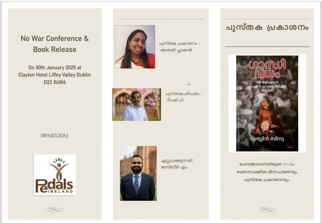 ഇന്ന് വൈകുന്നേരം 6 മണിക്ക് Liffey Valley യിലുള്ള Clayton Hotel ൽ വെച്ച് മഹാത്മാഗാന്ധിയുടെ 77ാം രക്തസാക്ഷിത്വ ദിനാചരണവും “യുദ്ധം ഒഴിവാക്കൂ ” എന്ന സന്ദേശവുമായി നടത്തുന്ന സമ്മേളനത്തില് വച്ച് ഡബ്ലിൻ ബിനുവിന്റെ “ഗാന്ധിവധം ”
