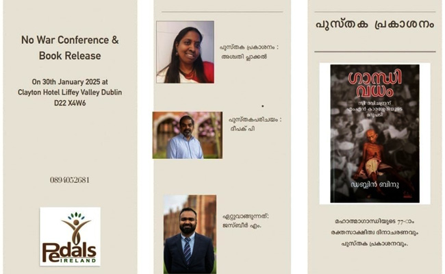 30 ജനുവരി 2025, വൈകുന്നേരം 6 മണിക്ക് Liffey Valley യിലുള്ള Clayton Hotel ൽ വെച്ച് മഹാത്മാഗാന്ധിയുടെ 77ാം രക്തസാക്ഷിത്വ ദിനാചരണവും “യുദ്ധം ഒഴിവാക്കൂ ” എന്ന സന്ദേശവുമായി നടത്തുന്ന സമ്മേളനത്തിലാണ് പുസ്തകം പ്രകാശനം ചെയ്യുന്നത്. ഇന്ത്യയിലെ സമകാലീന സാമൂഹിക രാഷ്ട്രീയത്തെ സഹായിക്കുന്ന രീതിയിൽ ഗാന്ധി വധത്തെ അവഹേളിച്ചും നിന്ദിച്ചും പ്രസംഗവും പുസ്തകവും ഇറക്കിയ ശ്രി C രവിചന്ദ്രന്റെ നിലപാടിന് പ്രതിരോധമായി ഇറക്കിയ “ഗാന്ധിവധം എന്ന ഈ പുസ്തകം സവിശേഷ പ്രാധാന്യം അർഹിക്കുന്നു.