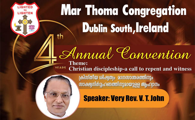 Mar Thoma congregation, Dublin South, Ireland-ന്റെ ആഭിമുഖ്യത്തിലുള്ള ഈ വർഷത്തെ കൺവെൻഷൻ ജൂലൈ 31, ഓഗസ്റ്റ് 1 തീയതികളിലും, Congregation Day വിശുദ്ധ കുർബാനയോടു ചേർന്ന് ഓഗസ്റ്റ് 2 ശനിയാഴ്ച രാവിലെ 10 മണിക്കും Nazarene Community Church, Greystones, Wicklow, A63YD27 വെച്ച് നടത്തപ്പെടുന്നു.