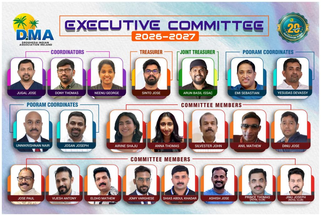 ദ്രോഹഡ ഇന്ത്യൻ അസോസിയേഷന്റെ (DMA) ഇരുപതാമത് വാർഷിക പൊതുയോഗം തുള്ളിയാലൻ ഹാളിൽ വെച്ച് 07/03/2026-ന് എമി സെബാസ്റ്റ്യന്റെ അധ്യക്ഷതയിൽ കൂടി. ഒരു വർഷത്തെ വരവ് ചിലവ് കണക്കുകൾ ട്രഷറർ ഡോണി തോമസ് അവതരിപ്പിച്ച് പൊതുയോഗം പാസാക്കി. തുടർന്ന് അടുത്ത വർഷത്തേക്കുള്ള പുതിയ കമ്മറ്റിയെ പൊതുയോഗം തിരഞ്ഞെടുത്തു. 20 വർഷം പൂർത്തിയാകുന്ന സംഘടന അയർലണ്ടിലെ തന്നെ മികച്ച സംഘടനയാണ് എന്ന് പൊതുയോഗം വിലയിരുത്തി. തുടർന്നും നല്ല രീതിയിൽ മുന്നോട്ടു പോകാൻ പുതിയ ഭാരവാഹികൾക്ക് എല്ലാവിധ ഭാവുകങ്ങളും നേർന്നുകൊണ്ട് പൊതുയോഗം അവസാനിച്ചു.